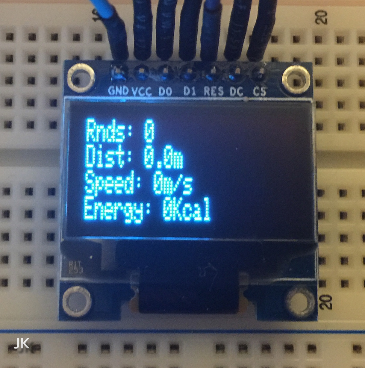 Die zurückgelegte Strecke wird bei bedarf aus den beiden Zähler-Werten errechnet und auf dem OLED-Display auf der Seite 1 ausgegeben. Die Seite 2 zeigt die Geschwindigkeitswerte an.